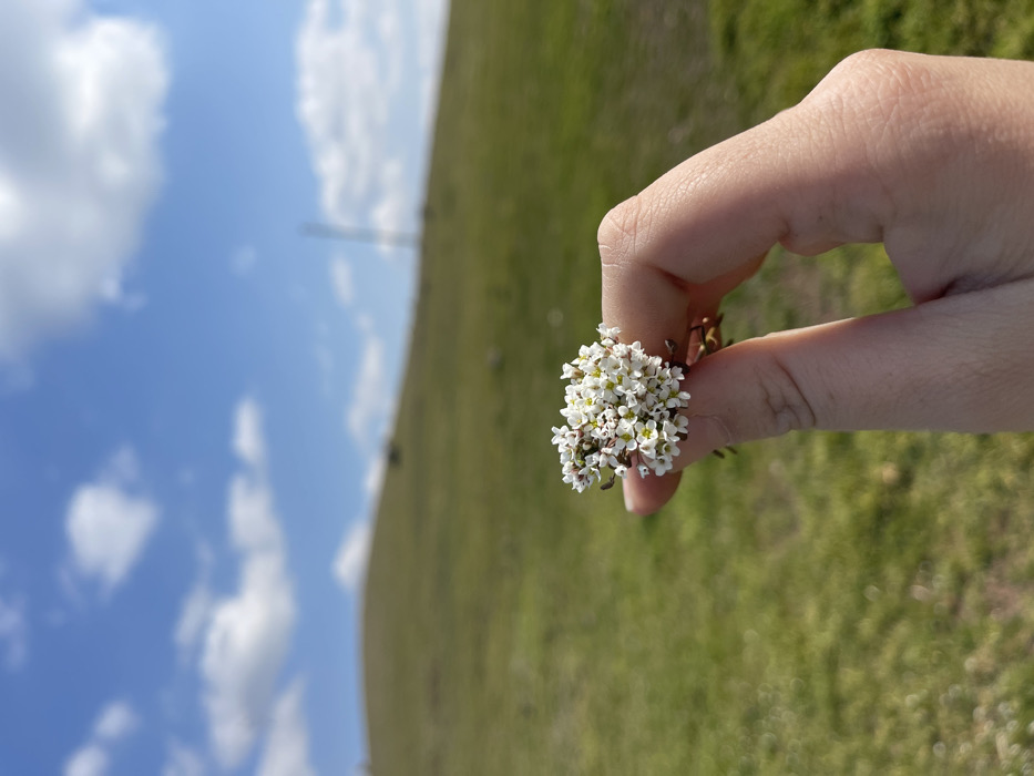 - "The image displays a human hand, specifically the thumb and index finger, holding a cluster of small white flowers with yellowish centers" by FM-8MhsB2, licensed under CC BY 4.0