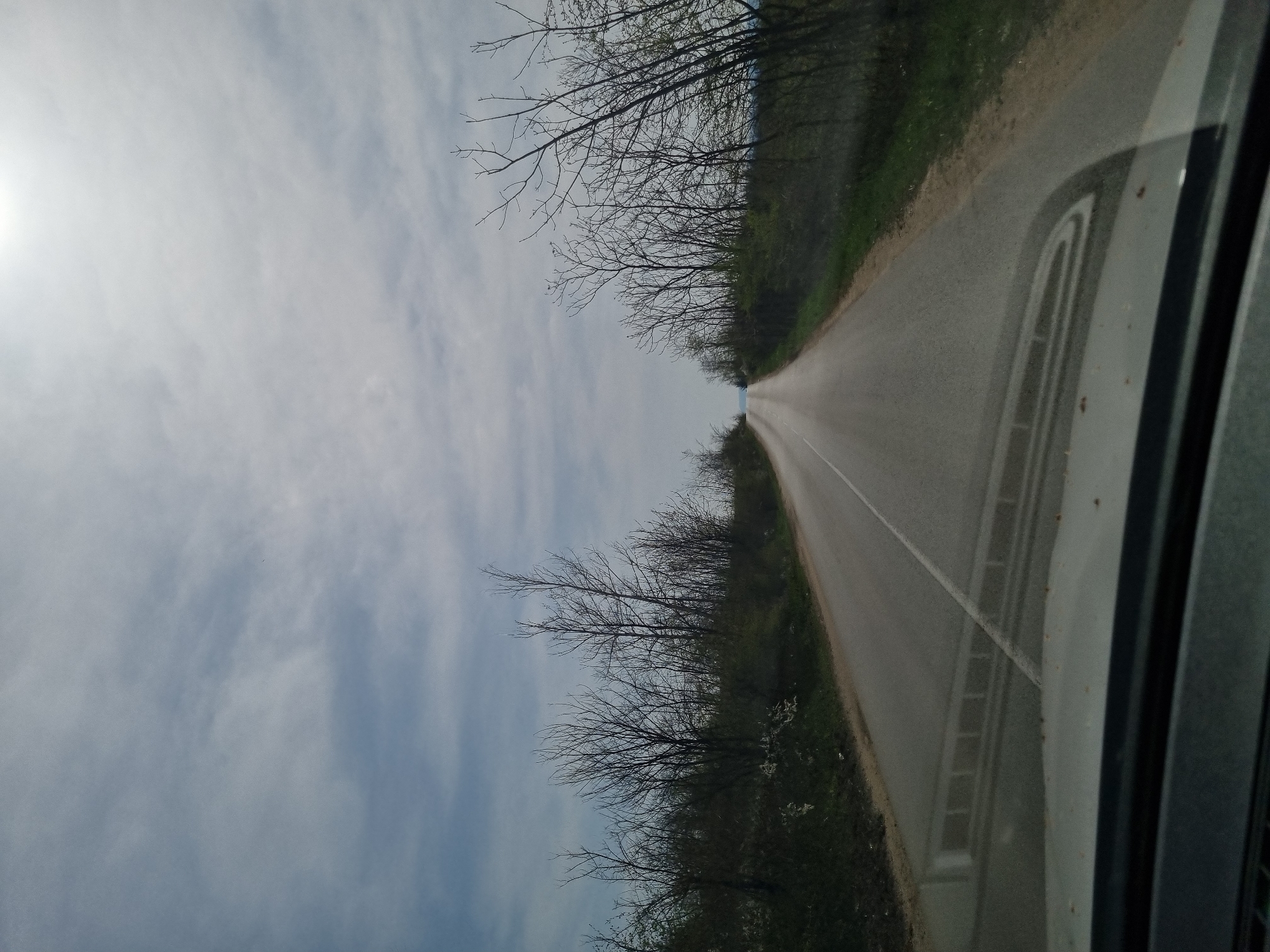 road in Sheremetia, Bulgaria. The view is from inside a vehicle looking forward onto a gray asphalt road with a white center line. Bare trees line both sides of the road, with some greenery visible underneath. The sky is cloudy, with a bright light source (possibly the sun) at the left. Part of the vehicle's interior is visible in the lower right corner of the frame.