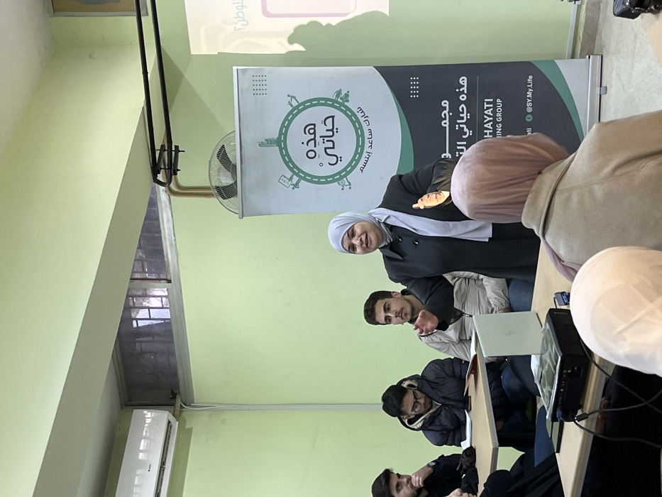 An indoor educational or training session is depicted in Al-Mazza Municipality, Syria