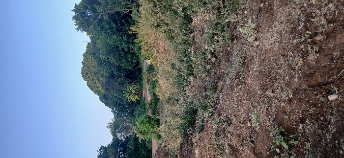 The image displays an undeveloped outdoor landscape in Sagana, Kenya, under a clear, light blue sky. The foreground is composed of dark brown soil, disturbed in areas with visible clods and small stones, interspersed with scattered dry plant debris and sparse, small green weeds. The midground features a rising terrain covered with a denser growth of various shrubs and taller herbaceous plants, primarily green but with some drier, lighter foliage. A faint, lighter-colored ground track or path is subtly visible near the center of the midground. The background is dominated by a dense canopy of mature, dark green trees forming a continuous treeline. Within this treeline, slightly left of center, a distinct cluster of lighter green, broad-leafed vegetation is present. No individuals, animals, structures, or objects of human origin are discernible within the depicted scene.