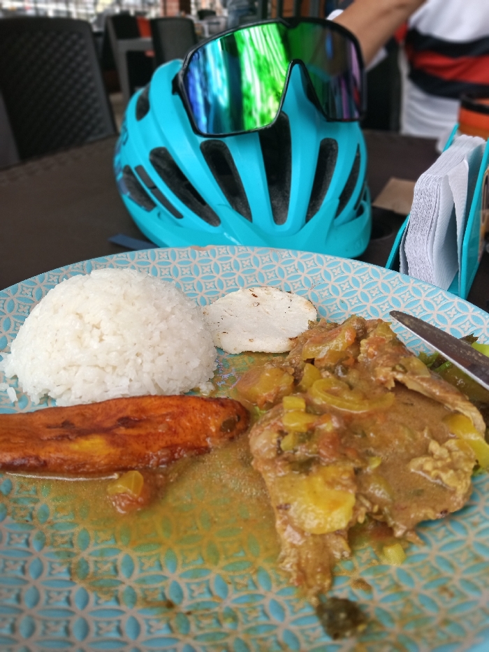 A turquoise plate with a geometric pattern holds a meal of white rice, a fried plantain, a small white cake, and meat stewed in a light-colored sauce with visible green peppers and other vegetables. A knife lies beside the meat. In the background, a blue bicycle helmet topped with reflective sunglasses rests on the table. A blue napkin holder with white napkins sits beside the helmet. Chairs are visible in the blurred background.