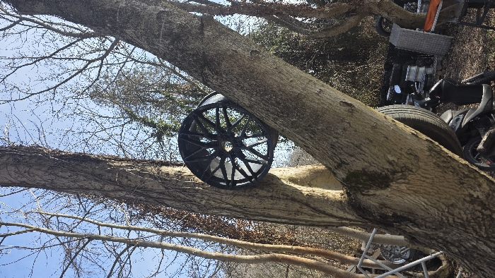 The scene depicts an outdoor environment, specifically identified as a location within Veliko Tarnovo, Bulgaria. The primary subject is a black multi-spoke alloy wheel, positioned and wedged approximately 2-3 meters high between two prominent tree trunks. The tree on the left has a darker, textured bark, partially covered by climbing vines. The tree on the right has lighter, furrowed bark and angles upward to the right. Both trees, along with numerous others in the background, are bare of leaves, indicating late autumn or winter conditions. A clear blue sky is visible through the sparse branches. At ground level, partially visible in the lower center and right, an outdoor area is cluttered with various items. A black scooter or small motorcycle is parked at the base of the right tree trunk. Above it, a single black rubber tire leans against the trunk. To the right and rear, a collection of objects includes multiple stacks of black rubber tires, several silver-colored alloy wheels, and a grey or beige woven outdoor chair or furniture item leaning on its side. An orange tarp or fabric is also partially visible on a structure in the far right foreground. To the lower left, a metallic, possibly silver-colored, rack or frame is discernible. No individuals are present in the image.