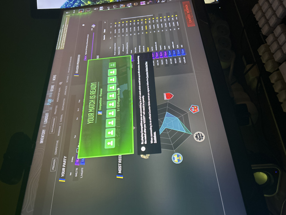The scene is an interior shot within Plovdiv, Bulgaria, focusing on a computer monitor and immediate surrounding objects. The monitor displays the main interface of a video game, identified as Counter-Strike 2, specifically the "Play" tab for online matchmaking. A prominent green rectangular overlay in the center reads "YOUR MATCH IS READY!" with "Competitive - Premier" below it. A row of ten generic player icons is visible beneath this text, nine illuminated in green to signify readiness, and one in gray, indicating "9/10 Players Ready." A white mouse cursor points towards the "Ready" status. Below the match readiness overlay, a smaller black text box presents a warning regarding commitment to a full match and mentions "Counter-Strike Fair Play Guidelines." To the left, a "YOUR PARTY" section displays numerical rankings and CS Rating information. To the right, a "SEASON PROGRESS" bar and a "Friends" list with user names, win percentages, and CS Ratings are visible. A radar chart-style graphic with various colored icons (yellow, red, black) is partially visible in the lower-middle section of the screen. Mounted centrally on the top edge of the monitor is a dark, elongated object, likely a webcam or soundbar. In the bottom-left corner of the image, a black speaker with a glowing blue indicator light is present. In the bottom-right, a segment of a white mechanical keyboard with visible keycaps is depicted. Partially obscured beneath the monitor, a white multi-outlet power strip is visible. The room is dimly lit, with the monitor's display serving as a primary light source. No individuals are visible in the frame; however, active user interaction with the game interface is implied by the on-screen mouse cursor and the match readiness notification.
