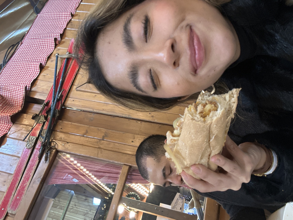 A woman holds a partially eaten sandwich in her right hand. She's indoors with wood-paneled walls. Red and white checkered fabric is visible on the wall. An older set of skis is affixed to the wall, along with poles. Another person, possibly a man, is behind the sandwich, partially obscured. The sandwich contains a fried filling and some long fries. The woman is smiling with her eyes closed. She wears a black top and multiple bracelets.