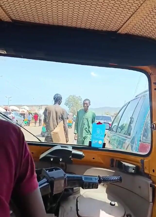 The video appears to have been filmed from inside an auto rickshaw, also known as a tuk-tuk. The perspective is through the windshield, showing a busy street scene in what seems like a market area. People are walking around, some carrying boxes or bags. There are other vehicles on the road, including motorcycles and cars. The weather looks sunny. The interior of the tuk-tuk is visible, showing the steering mechanism and dashboard. The video is somewhat shaky, likely due to the movement of the vehicle. At times, the view is obscured by passengers moving around in the tuk-tuk.