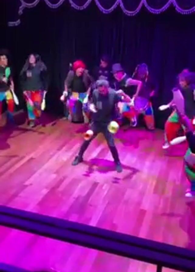 On a wooden stage lit with purple and red light, about a dozen people wearing similarly-styled outfits are performing. The outfits consist of black tops and multicolored, patchwork-patterned bottoms. Some performers also wear hats of various styles and colors. Several performers are juggling clubs, while others are playing hand drums. The stage has a black curtain backdrop adorned with white trim along the top. A partial view of the audience behind a railing is visible in the foreground. The overall setting suggests a theatrical or performance venue.