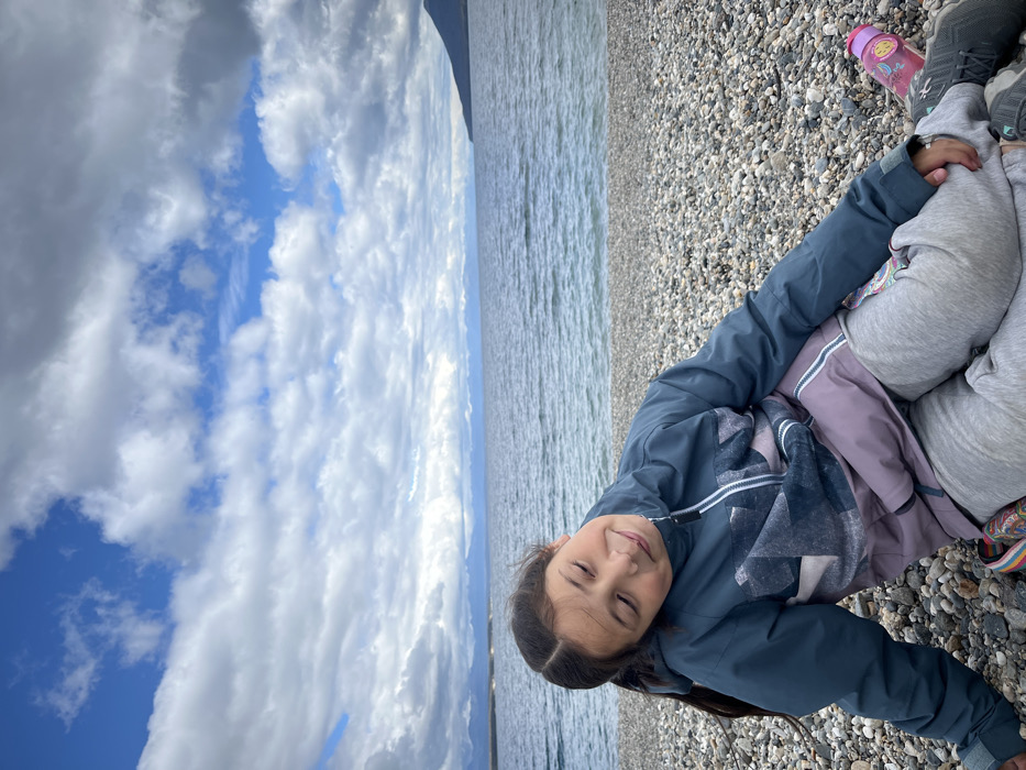 A young individual is seated on a pebbled beach in Municipio de Tolhuin, Argentina. The subject, a child or pre-teen with dark hair, is positioned in the lower-left to mid-right of the frame, leaning back with their head tilted right and eyes partially closed. They are dressed in a dark teal/blue jacket with a patterned front and purple lower section, grey sweatpants, and dark athletic shoes. A pink water bottle with a yellow cap and a smiley face sticker rests on the pebbles to their right. The foreground consists of a dense layer of multi-colored pebbles. Beyond the beach, a large body of light blue-grey water with visible surface ripples extends across the midground. The horizon features distant mountainous landforms, with a distinct darker landmass prominent on the far right. The sky overhead is partially clear blue, interspersed with substantial white and grey cloud formations.