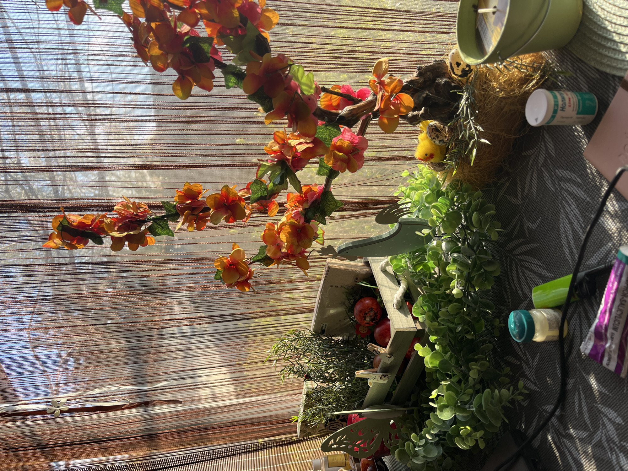 still-life arrangement indoors, possibly near a window with a brown string curtain. Artificial orange flowers hang from a branch, near a decorative wooden birdhouse filled with artificial greens and what appears to be artificial fruit. To the right, a decorative pot with hay and a small yellow bird figure sits next to containers of what appears to be medicine. The image lacks the necessary details to confirm the location in Dobrich, Bulgaria.
