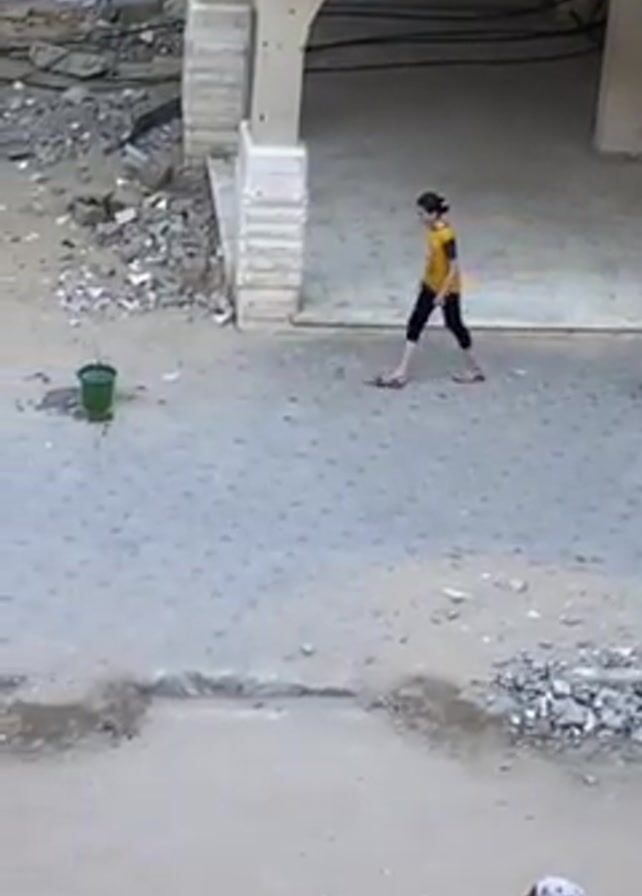 A young girl, dressed in a yellow shirt, black leggings, and pink sandals, is standing on a paved area and reaching towards a green bucket. She is bending over to the left of the frame, with her face mostly obscured. The pavement is made up of gray bricks with a pattern, and the edges of the paved area are bordered by dirt and debris. To the left of the girl, there is a pile of rubble and what appears to be construction debris. Behind the girl, there is a building structure with an arched entrance, and a wall with a UNICEF logo visible on the far left. In the bottom right corner of the frame, there is another person, possibly an adult, partially visible wearing a white hijab and a dark outfit. A black bucket is visible to the right of the young girl.