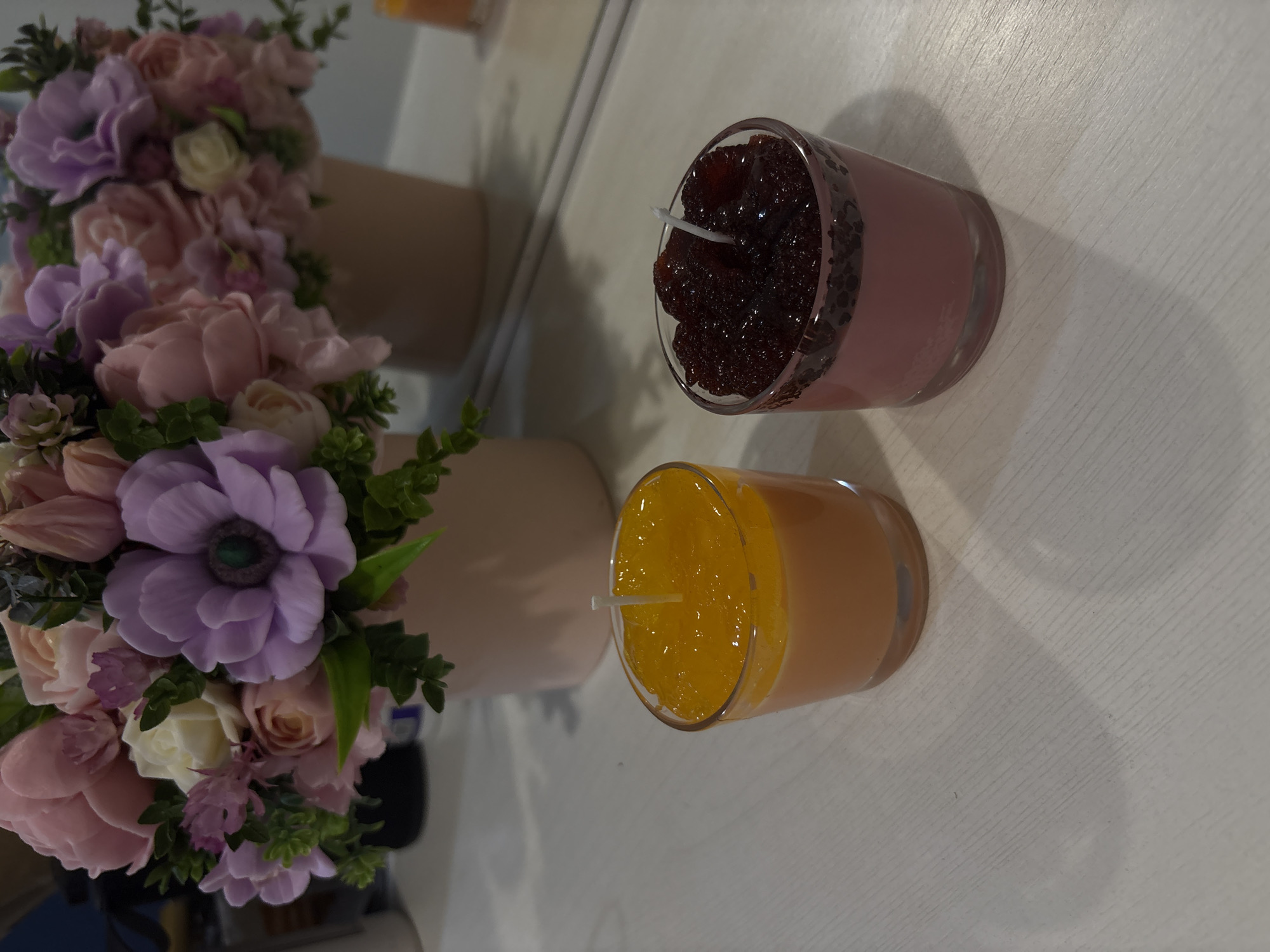 two unlit candles in glass containers, a bouquet of artificial flowers in a vase, and a reflective surface, likely a mirror or glass panel, all set on a light-colored, textured surface. One candle is filled with a dark, textured material resembling dried fruit or coffee beans, set in a pink-tinted wax base. The other candle contains a translucent yellow substance that looks like gel or wax. The artificial flower arrangement consists of pink, lavender, and white roses, anemones, and greenery, arranged in a light pink vase. The background includes a partial reflection of the flowers and vase. The setting appears to be indoors. The location of Simferopol, Ukraine is not evident from the image content.