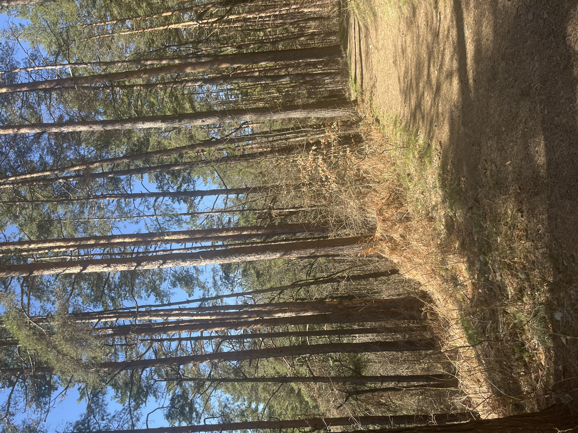 The image depicts a view in the forest of Zheleznitsa, Bulgaria. Numerous tall, thin trees with brown trunks and green foliage extend toward a blue sky. A dirt path, covered with dried vegetation and dappled with shadows, runs along the edge of the treeline. The image appears to have been taken in natural daylight. No people or animals are visible.