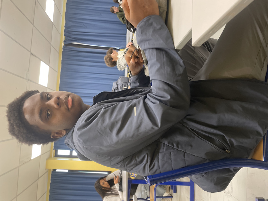 The image portrays an indoor classroom or lecture hall located in Hérouville-Saint-Clair, France. The central subject is a young Black male, appearing to be a teenager, seated at a light-colored desk in a blue metal chair with a wooden seat. He wears a dark grey or blue padded jacket over dark clothing and light grey pants. His dark, curly hair is styled high. He directs a neutral, steady gaze towards the viewer, with his lips slightly parted. His left hand rests on the desk, holding a thin black cord or strap, while his right forearm and hand are partially visible, also resting on the desk surface. In the mid-ground to the left, a young female with long, dark hair and a white long-sleeved top is seated at a separate light-colored desk, engaged with a mobile phone held in her hands. A yellow structural pillar is visible behind her, adjacent to a window section. Further in the background, to the right, multiple other individuals, mostly young people, are seated at similar desks; one wears a grey hoodie, another a dark green top. The environment features light-colored walls, a ceiling with white rectangular acoustic tiles and recessed fluorescent light fixtures, and prominent blue curtains covering a wall section. The scene is evenly illuminated by artificial overhead lighting.