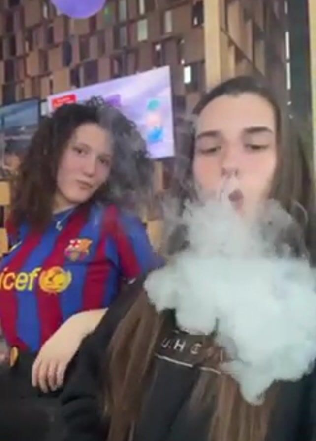 Two young women are indoors, possibly in a lounge or cafe. The woman in the foreground has long brown hair and is wearing a black hoodie. She is exhaling a large cloud of smoke. Behind her, a second woman with curly brown hair is wearing a Barcelona soccer jersey. There are decorations of light-colored balloons near the ceiling. A television screen is visible in the background behind the woman in the soccer jersey. The wall behind the TV has a wood-paneled design.
