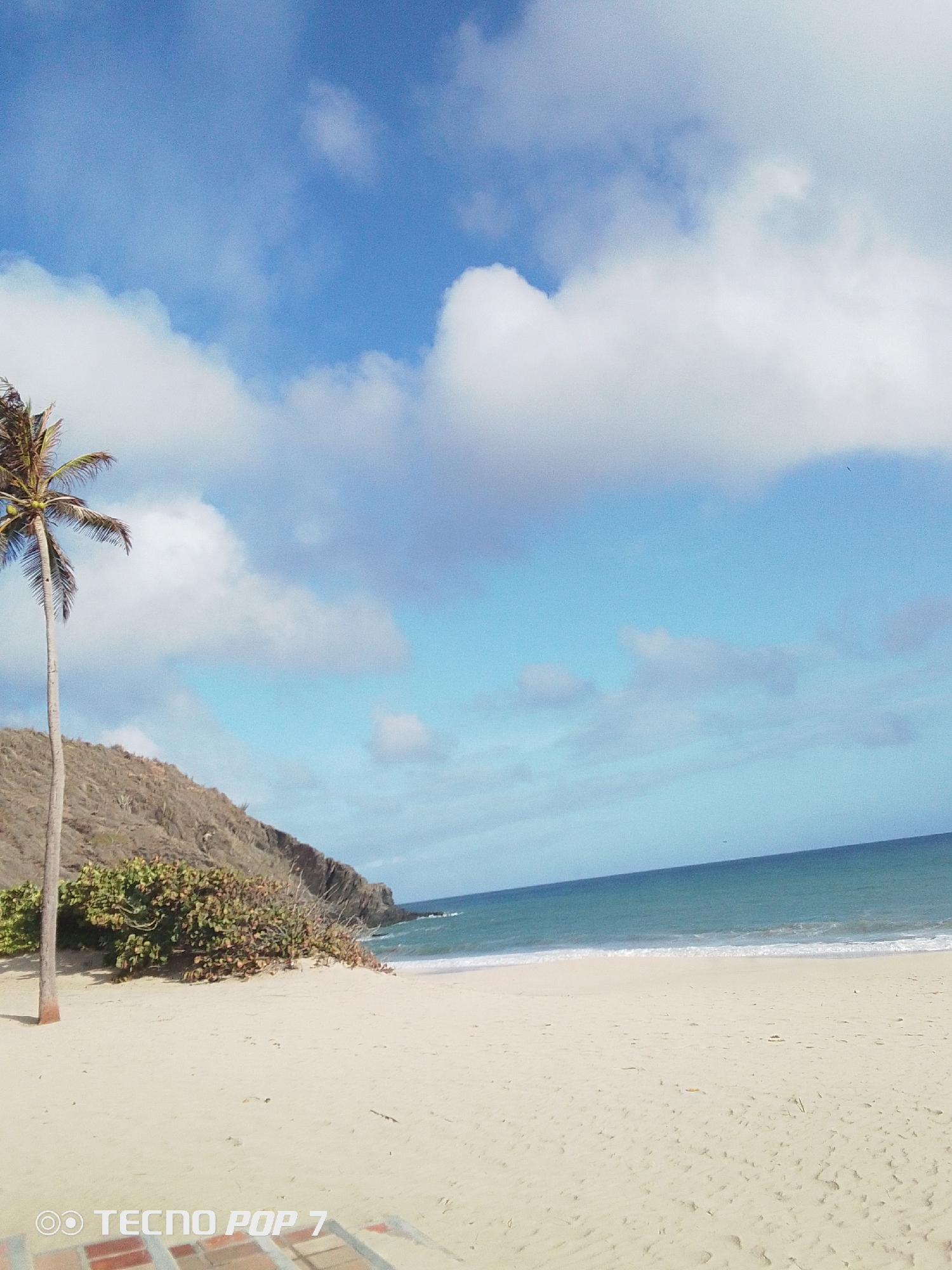 beach scene in Pedro González, Venezuela. The foreground features a sandy beach with visible footprints. To the left, a tall, slender palm tree stands near a small, vegetated hill. The middle ground includes the ocean, with small waves breaking on the shore. The background shows a partly cloudy sky with blue patches. The horizon line is visible where the ocean meets the sky. At the bottom left corner, the text "TECNO POP 7" is superimposed on the image.