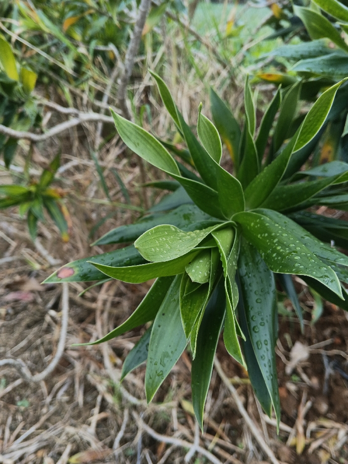 A vibrant green plant with long, pointed leaves dominates the frame. Droplets of water cling to its foliage. The leaves are arranged in a circular pattern, growing upwards and outwards. The background is a mix of dry, brown vegetation, suggesting a natural outdoor setting. A few stray twigs and small plants are scattered around the base of the main plant.