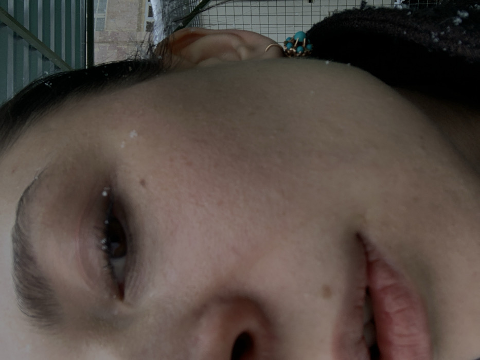 - "A close-up, vertical image depicts the right half of a young adult female's face, dusted with small white flakes consistent with snow or ice" by FM-cuWTj1, licensed under CC BY 4.0