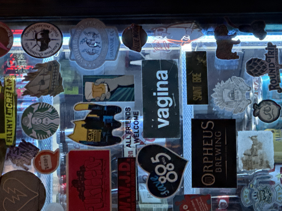A sticker-covered surface features diverse designs. Logos include "Starbucks," "Orpheus Brewing," "Round Trip Brewing Company," and "Southbound Savannah, GA." A sticker reads "vagina" in bold letters. Other stickers show phrases: "FILTHY LUCRE," "ALL FRIENDS WELCOME," "SAINT BRE" and "save 88.5 WRAS." There's also a hand holding a beer. Graphics include a spaceship-like object, a heart, and various abstract shapes.