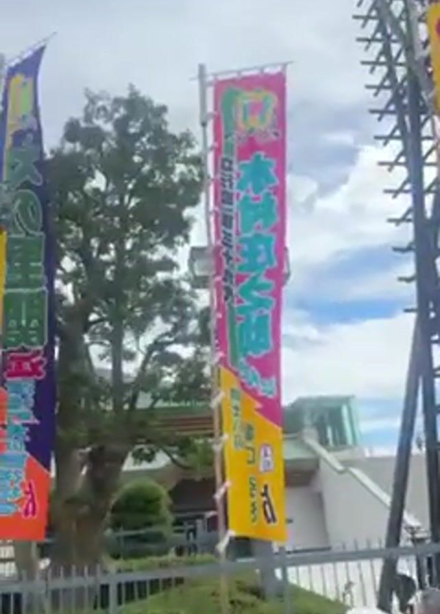 crowd of people in front of a building in Japan. There are several colorful banners with Japanese writing. There is a tall tower behind the banners. People are walking towards the building. Some are wearing traditional Japanese clothing. Behind the building, there are several modern skyscrapers. The sky is overcast.