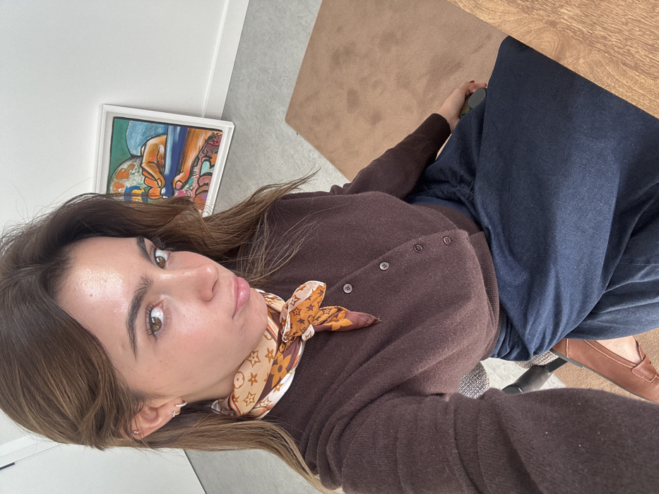 A young adult female is depicted in a close-up indoor selfie, looking directly at the camera. She has long brown hair, light skin, and is wearing a dark brown button-up cardigan, a patterned silk scarf with brown, orange, and white hues featuring stylized motifs, and a dark blue skirt. Silver hoop earrings are visible in both earlobes, and a helix piercing is present on her left ear. Her left hand, with red fingernail polish, is partially visible. A brown loafer is visible on her right foot. The background consists of a light grey floor, a white wall, and a white-framed artwork leaning against the wall. The artwork features abstract depictions of human hands and a foot in bright colors including orange, blue, and green. A light brown wooden surface with a rectangular brown mat is visible to the right. The location is Torres Vedras, Portugal.