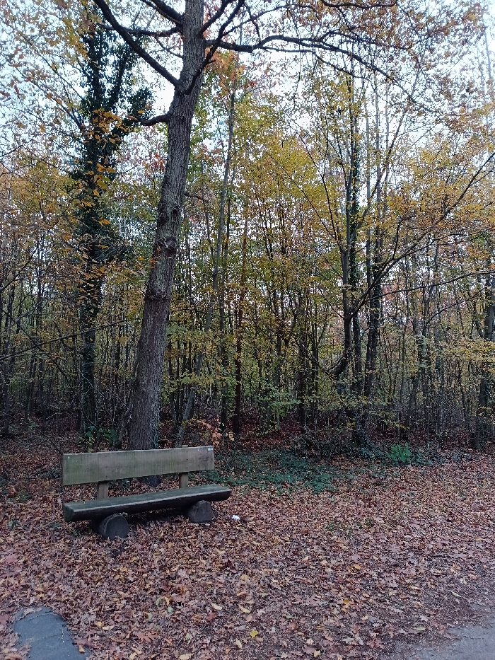 This image depicts an autumnal woodland scene in Brumath, France. In the foreground, positioned slightly to the left, is a rustic wooden park bench. The bench features a backrest constructed from two light-colored horizontal wooden planks and a seat made from a darker, split log. Two shorter, cylindrical logs serve as supports for the seat. Directly behind the bench, a prominent, tall deciduous tree stands with a dark, textured trunk and mostly bare branches extending upwards. To its left, another tree is partially covered with dark green climbing vegetation. The midground and background are dominated by a dense stand of deciduous trees, exhibiting yellow, golden-brown, and some remaining green foliage indicative of autumn. The ground area is extensively covered with a thick layer of fallen, dry leaves in shades of brown, orange, and yellow. A dark, paved surface, likely a pathway, is visible along the lower left edge of the frame. To the right of the bench, a small piece of white debris is visible on the leaf-covered ground. Patches of dark green ground cover are discernible deeper within the wooded area. The sky, visible through the sparse tree canopy at the top, appears uniformly light and overcast. No individuals or animals are present.