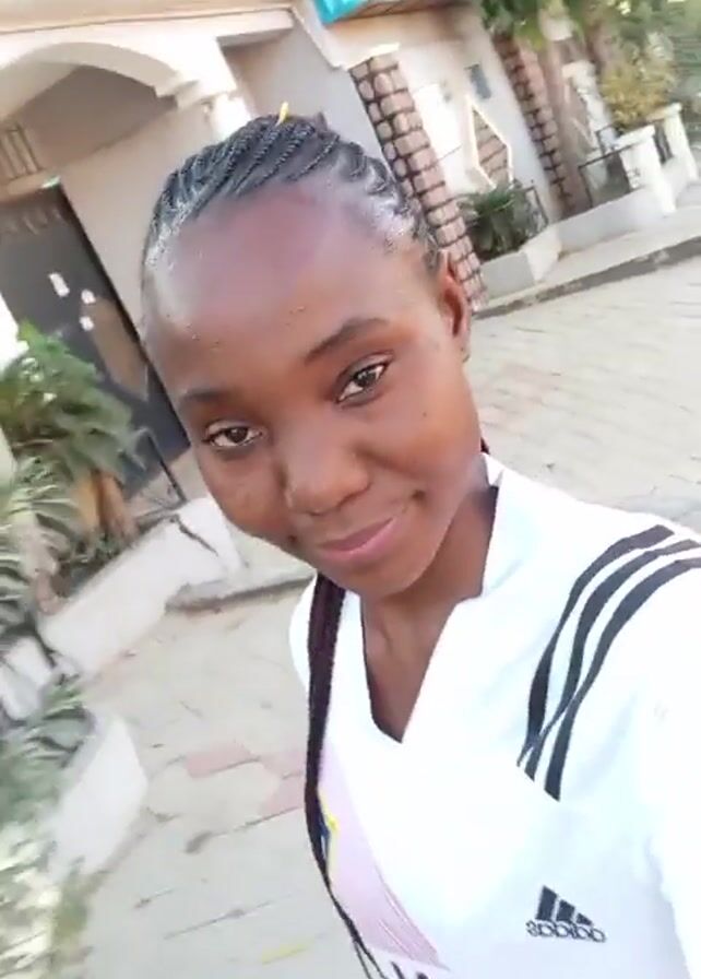 A woman stands on a paved walkway, facing the camera while filming. She wears a white Adidas t-shirt with three black stripes on the shoulder, and the words “HERBALIFE NUTRITION” printed on the front. Her hair is styled in neat braids. Behind her, a building with a brown metal gate and plants are visible. The walkway is made of hexagonal and rectangular paving stones. The camera moves, showing a building with pillars and a drain along the walkway. Tall trees are also visible in the background under a bright sky.