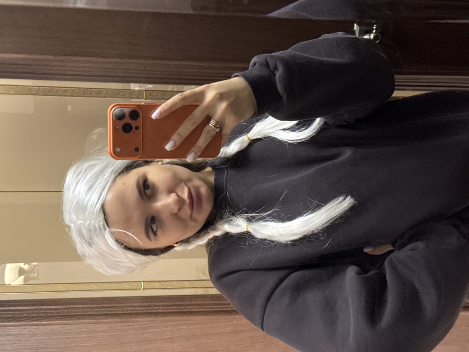 A young adult female is depicted in a mirror selfie, captured from the chest up in an indoor setting. She wears a dark grey long-sleeved sweatshirt and a white wig styled with a voluminous top and two long, white braids secured with yellow elastic bands. Gold stud earrings are visible on her ears. Her left hand holds an orange-cased smartphone, angled to capture her reflection; her fingernails are painted white with glitter, and multiple rings are worn on her left ring finger. Her lips are slightly pursed, and her gaze is directed towards the upper right. The background, visible in the mirror's reflection, consists of dark brown wooden paneling or doors with vertical gold trim. A light fixture is partially reflected in the upper portion of the mirror. No identifying features are present within the image to determine a specific location within Vysokinichi, Russia.