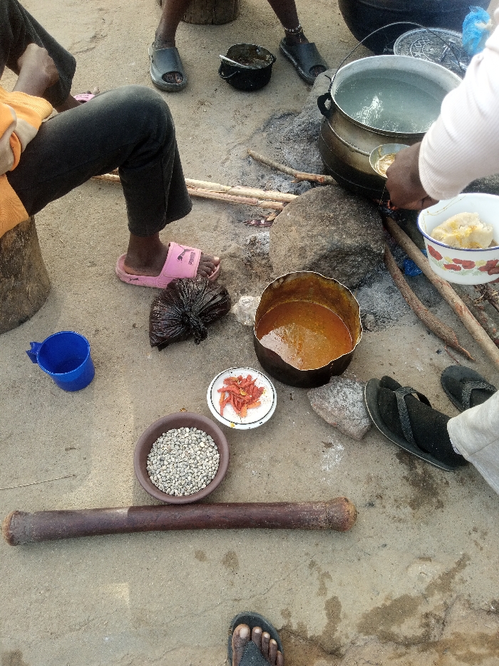 A group of people gather outdoors, preparing food. A large pot boils over an open fire. Nearby, bowls hold ingredients: beans, dried chilies, and a reddish-orange stew. Someone scoops food into a bowl, possibly fufu or similar starch. A blue plastic mug sits nearby, along with a wooden mortar and pestle. Sandals and bare feet are visible around the cooking area.