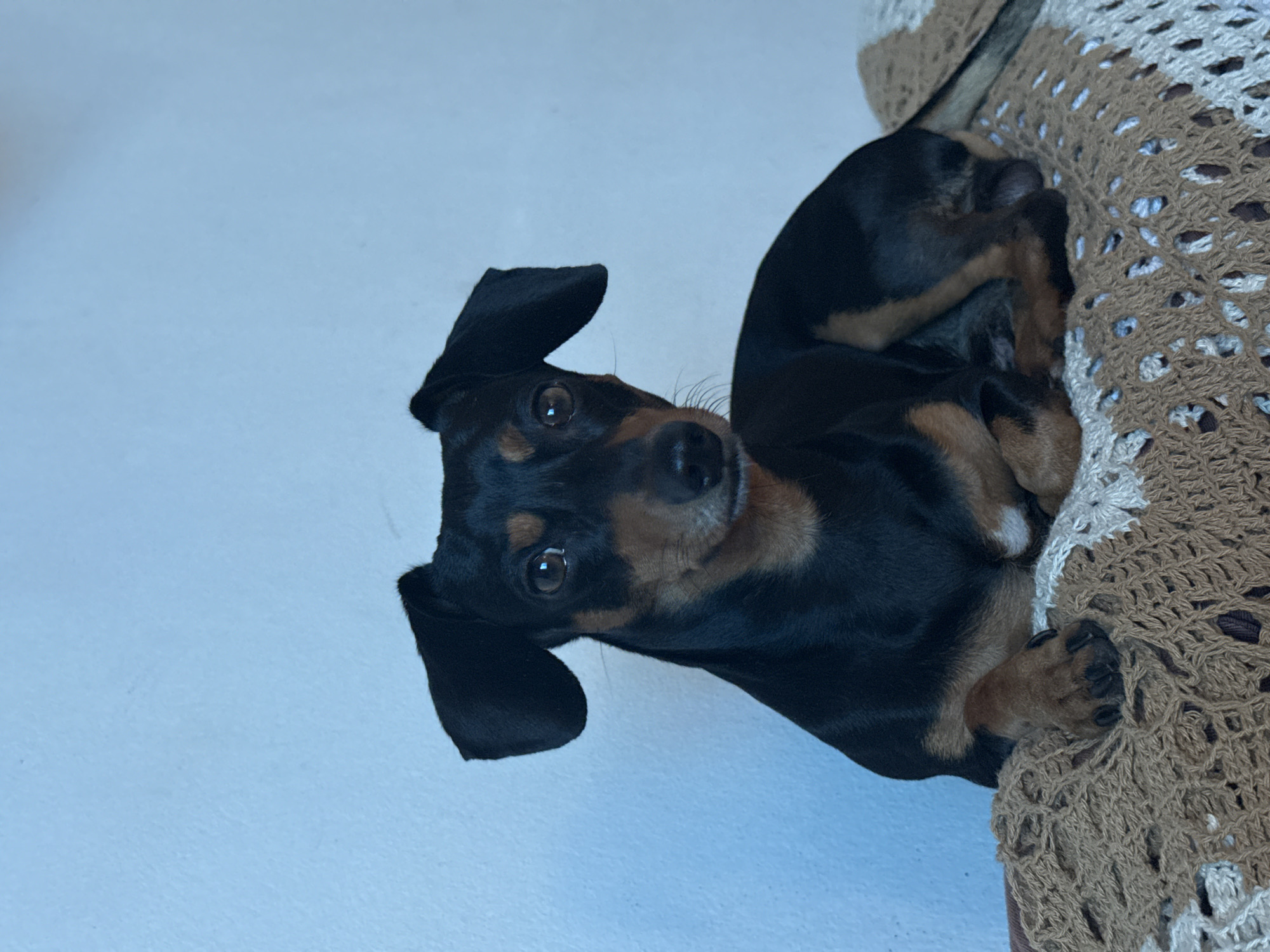 - "A short-haired, black and tan dog, consistent with a Miniature Pinscher or Dachshund type, is depicted resting on a crocheted blanket" by FM-MfmqH2, licensed under CC BY 4.0