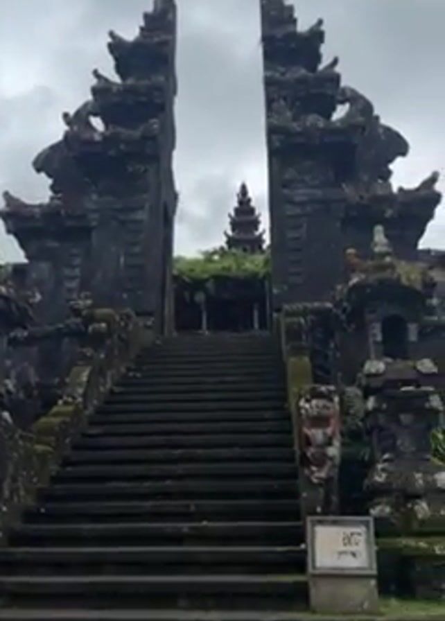 stone temple or complex. The first shot is of a large, ornate gateway with steps leading up to it. The stone is dark and covered in moss. The camera then pans to the side, revealing more of the complex, with steps and stone platforms covered in moss. A white dog walks into the frame and sniffs the ground. The camera follows the dog as it moves across the stone platforms. The camera then pans up to show a covered pavilion. The dog stops and looks at the camera.