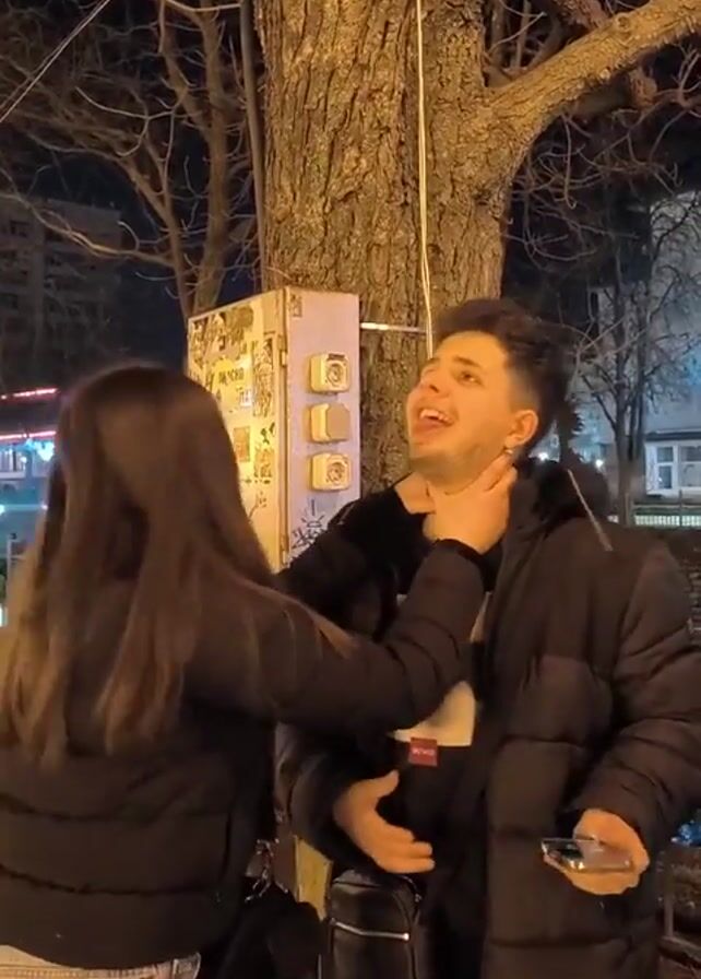At night outdoors, a woman in a black puffer jacket and jeans stands next to a man in a black puffer jacket. The woman reaches her hands around the man’s neck and touches it. The man holds a cell phone in his right hand and laughs. The background is a tree, light pole, and a junction box painted light purple, with a building and street lights visible in the distance.