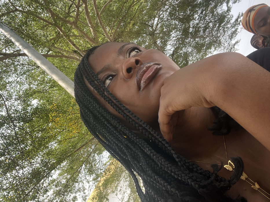 The image captures a young adult Black female in an outdoor setting, reportedly within Osu, Nigeria. She is positioned in the foreground, viewed from a low angle, with her gaze directed upwards and to the right, suggesting a pensive state. Her dark skin, full lips with a glossy finish, and numerous dark box braids are clearly visible. She wears a dark top and a gold-toned necklace featuring multiple small butterfly charms. Her right hand rests with fingertips against her chin, supporting her head. The background consists of a dense green tree canopy under a bright sky, with a grey pole extending diagonally through the foliage on the right. In the lower right corner, the top of another individual's head, covered by a striped headwrap, is partially visible, alongside faint traces of a third person's braids.