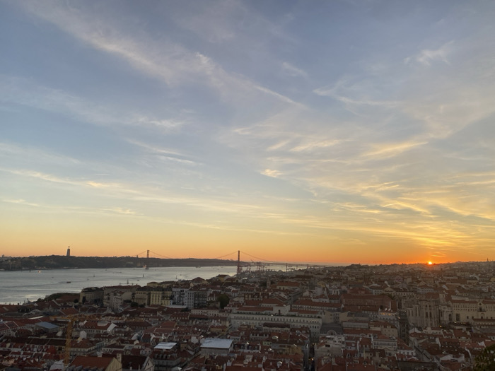 The image displays an elevated panoramic view of Lisbon, Portugal, captured during sunset. The lower two-thirds of the frame are filled with a dense urban landscape, characterized by numerous buildings predominantly featuring terracotta-tiled roofs and light-colored facades. The Tagus River occupies the midground, its surface reflecting the ambient light and showing several small boats. The 25 de Abril Bridge, a red suspension bridge, spans the river horizontally. On the far bank of the river, the Cristo Rei statue is distinctly visible atop a green hillside. The sun, appearing as a bright orange disk, is partially visible at the distant horizon on the right side of the frame, indicating an active sunset. The sky transitions from a light blue in the upper portion to vibrant orange and yellow hues near the horizon, streaked with scattered, wispy cirrus clouds. No discernible individuals or specific actions are visible within the scene.