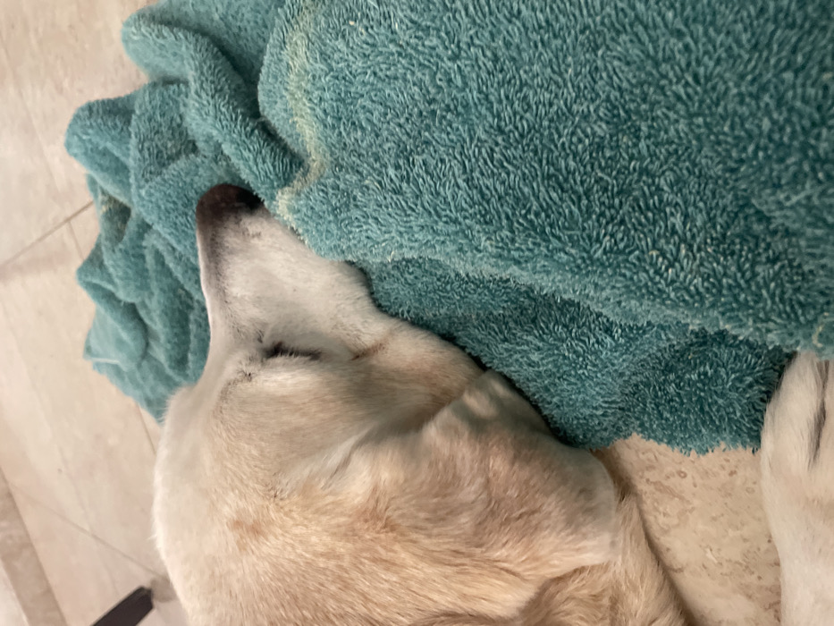 The image depicts a light-colored dog, likely a Labrador Retriever or similar breed, resting on its right side. Its head is prominent, with the right eye closed, and its dark snout is pressed against a crumpled, teal-colored, textured blanket or towel. The dog's fur is primarily cream or light tan. Portions of the dog's front legs and torso are visible, also covered in light fur. The dog appears to be asleep or in a relaxed state. The blanket shows some minor discoloration or variations in texture, particularly on the left side. The background and areas beneath the dog consist of a light-colored tiled floor with visible grout lines, suggesting an indoor setting. No discernible visual information within the image provides evidence to confirm its location in Coatzacoalcos, Mexico.
