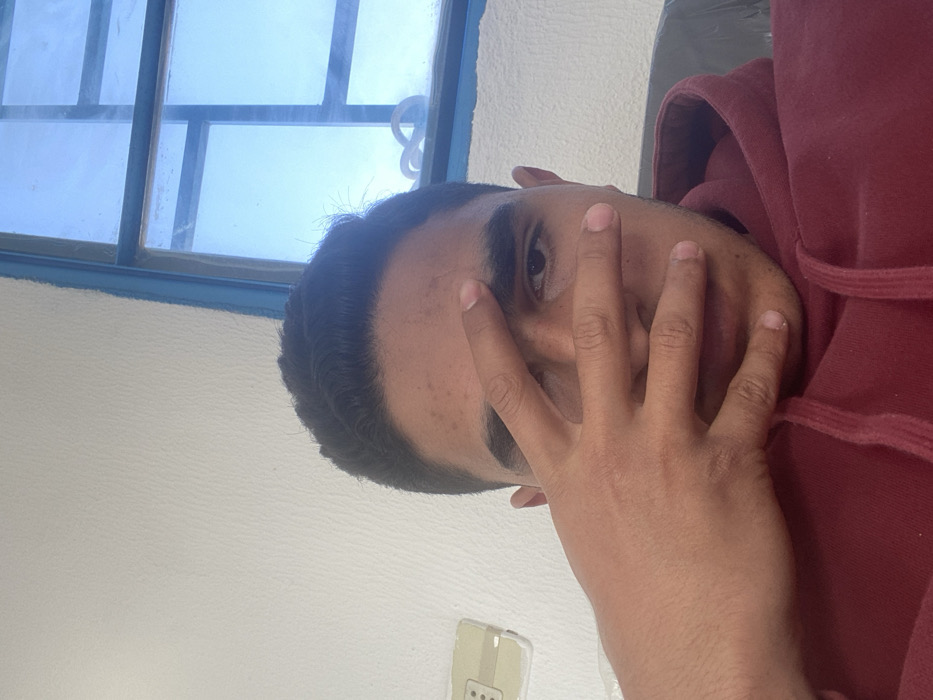 A man in a maroon hoodie partially covers his face with his hand, obscuring most of his features. One eye is visible, gazing towards the camera. He has short, dark hair. Behind him, a window with blue frames allows natural light into the room. The wall is a plain white. A small, beige electrical outlet is partially visible in the lower left corner of the image. The picture is taken at an angle, with the subject appearing sideways.