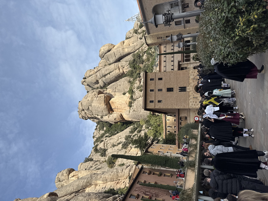 The image depicts an outdoor gathering at the Santa Maria de Montserrat Abbey complex, situated within the municipality of Monistrol de Montserrat, Spain