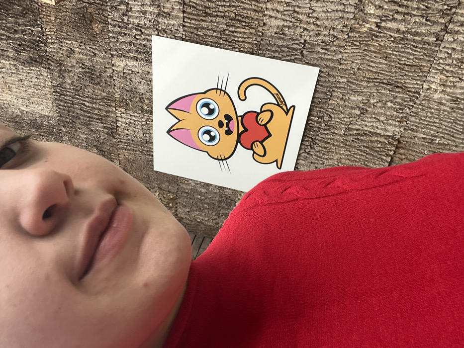 The image captures a close-up, angled perspective of a person and a graphic affixed to a tree trunk in Reichstett, France. On the left side of the frame, the lower portion of a person's face is visible, including the nose, mouth with a slight upward turn, and chin, which displays a minor reddish blemish. The person is wearing a solid red garment, possibly knit, exhibiting a textured pattern on the visible upper right shoulder. To the right, a white rectangular graphic is vertically attached to the deeply furrowed, dark brown bark of a tree trunk. The graphic depicts a cartoon illustration of an orange cat with large blue eyes, pink inner ears, and black whiskers. The cat is portrayed in a seated position, holding a red heart between its paws. A small, faint signature, "stypucat," is visible on the cat's right foreleg. The tree bark shows distinct, vertical ridging consistent with a mature tree.