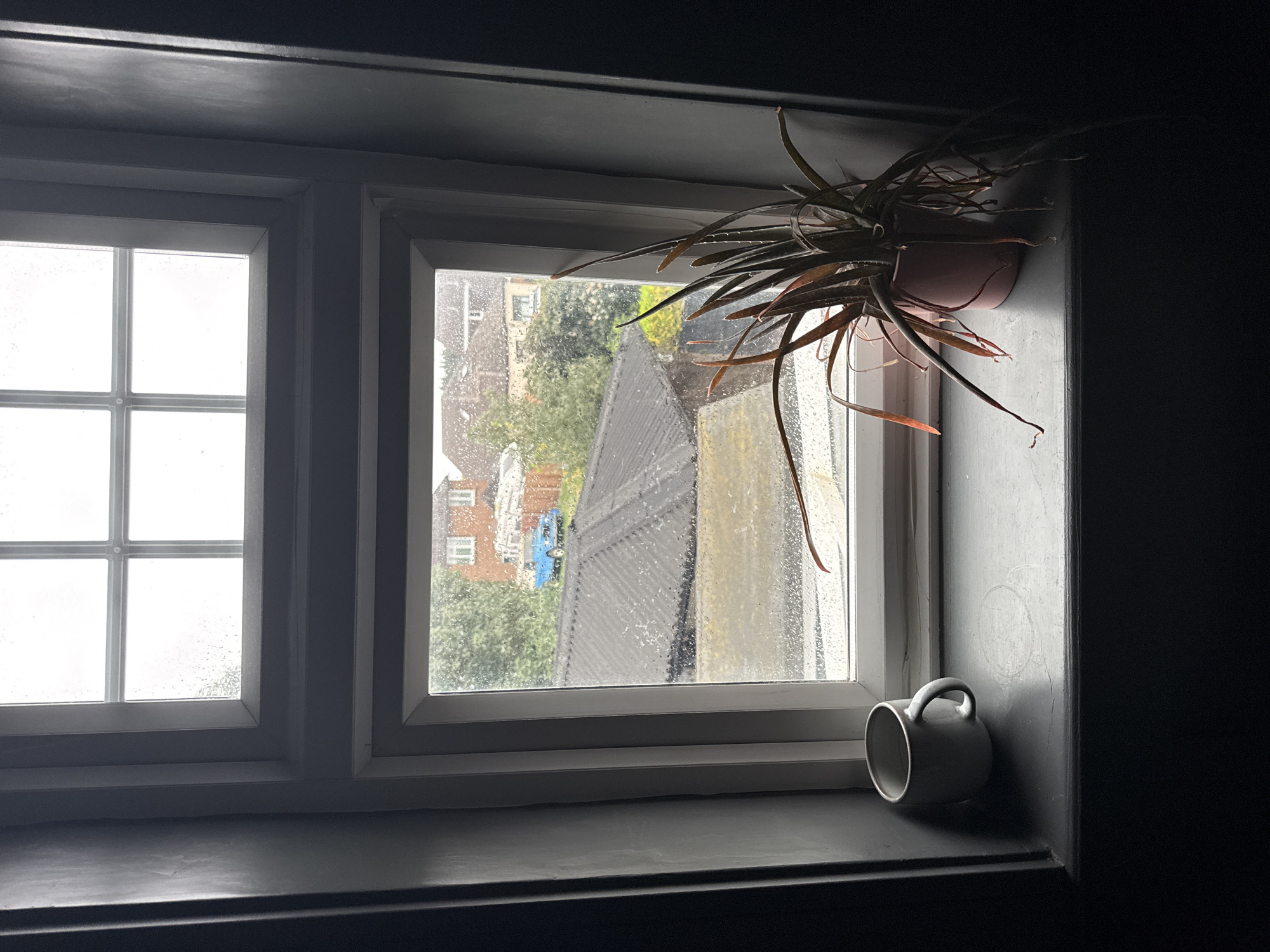 A view through a window in Hitchin, United Kingdom, on a rainy day. Two window panes are visible, the left having a grid pattern. Through the window, buildings are visible, including a blue vehicle parked outside. A potted plant sits on the windowsill to the right, with long, thin leaves. A grey mug is also on the windowsill. The window frame is painted grey.