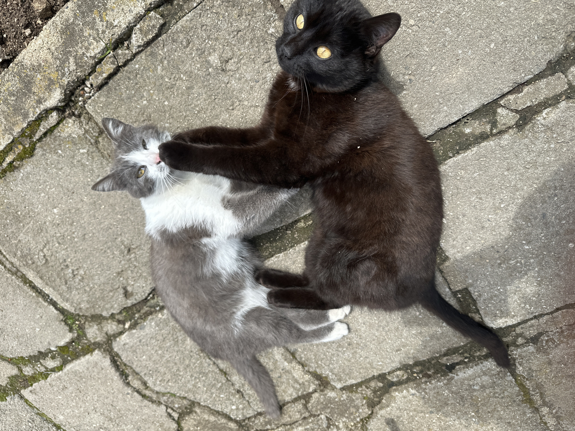 The scene is situated outdoors in Choba, Bulgaria, depicting two domestic cats on a surface of light gray concrete paving slabs. The concrete exhibits multiple cracks and seams, with moss and dark soil visible within the crevices. One cat is a medium-sized, domestic short-haired individual with gray and white fur. The majority of its body, including its back, head, and tail, is gray, while its chest, belly, paws, and parts of its face are white. It possesses a pink nose and yellowish eyes, with the right eye appearing partially closed or squinted. This cat is positioned towards the upper left quadrant of the frame, standing or crouching with its body oriented somewhat diagonally downwards and to the right. The second cat is a medium-sized, domestic short-haired individual with entirely black fur and prominent bright yellow-orange eyes. It is lying on its back in the lower right quadrant of the frame, with its head turned upwards and slightly to the right, away from the gray and white cat's face. Its front right paw is extended upwards, making contact with the facial area, specifically near the nose, of the gray and white cat. The interaction between the two cats appears to be non-aggressive, with the black cat's paw gently touching the gray and white cat's face. The environment is illuminated by natural light, casting subtle shadows and highlighting debris, possibly dust or small plant matter, on the concrete surface and lightly on the black cat's fur.