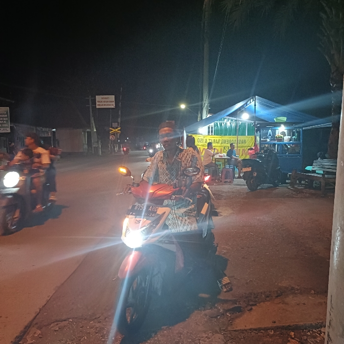 man, wearing a dark-colored shirt and a white cap, driving a motorcycle. The motorcycle is white with a red seat and is facing the camera. The man is wearing a light-colored shirt with a pattern and a white cap. He is looking straight ahead. The motorcycle is parked in front of a blue awning with a yellow sign that says "ISI 1 & TAHU GORENG SAJA". There are other people and objects in the background but they are not clear. The environment is nighttime and the lighting is dim. This scene is in Kecamatan Kaliwungu Selatan, Indonesia, located at latitude -6.958 and longitude 110.245.