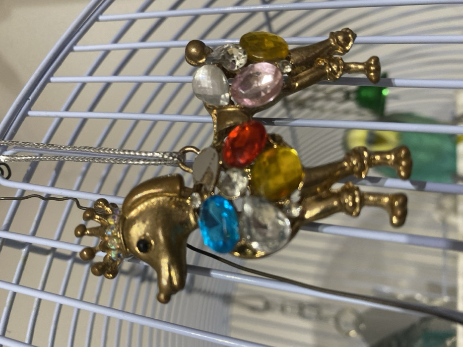 - "A jeweled horse necklace rests on a light blue wire cage" by FM-gOly33, licensed under CC BY 4.0