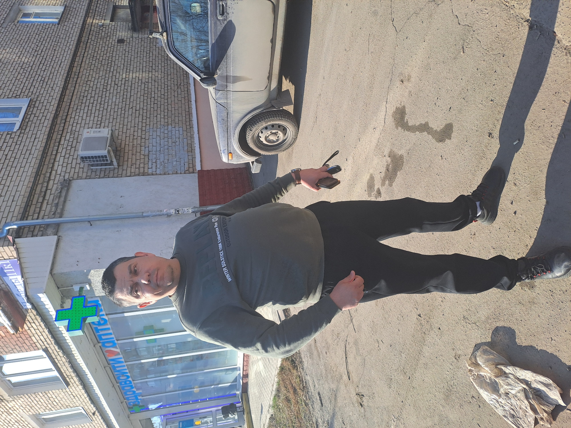 The scene depicts an adult male standing on cracked asphalt, facing the camera, on a clear, sunny day in front of a commercial building in Меткомелино, Russia. The man, appearing middle-aged with short dark hair, wears a dark olive-green long-sleeved sweatshirt with white text, black athletic pants, and dark sneakers with red accents. He has a dark watch on his left wrist. His left hand is in his pocket, while his right hand holds a black smartphone and car keys. Behind the man to his left is a "ЗДРАВСИТИ АПТЕКА" (Zdravcity Pharmacy) with large glass windows and doors, illuminated by blue neon lighting and topped with a prominent green cross sign. A partially visible street sign above the pharmacy reads "Плеханова 11К1". The building itself is two-storied, constructed of light-colored brick, with white-framed windows. An external air conditioning unit is mounted on the brick wall to the right of the pharmacy entrance. To the man's right, a dirty, dark-colored SUV, resembling a Lada Niva, is parked on the street. It features a visible roof rack and is covered in dust or mud. On the ground near the man's left foot, a crumpled, light-colored plastic bag is visible. The asphalt surface exhibits multiple cracks and what appear to be wet or oily stains. The strong sunlight casts distinct shadows of the man and the vehicle to the right.