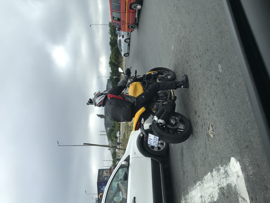 The image captures an urban street scene in Midrand, Gauteng Province, South Africa, under an overcast sky. A person, identified as a rider, is seated on a yellow Ducati Monster motorcycle with license plate HT9 5ZKGP. The rider is equipped with a white and red full-face helmet featuring a top-mounted action camera, a grey and red motorcycle jacket, a black backpack, black motorcycle trousers, and black boots, with their right foot placed on the asphalt. The motorcycle is stationary alongside a white Nissan SUV, visible on the left. To the right, in the background, an orange Volkswagen T3 minivan is visible. The road surface is asphalt, marked with faded white lines. A deceased rodent lies on the asphalt near the rear wheel of the yellow motorcycle. The background includes multiple streetlights, utility poles, large industrial or commercial buildings, and a billboard with partially discernible text, including "FLYFOO." The scene depicts a moment in traffic.