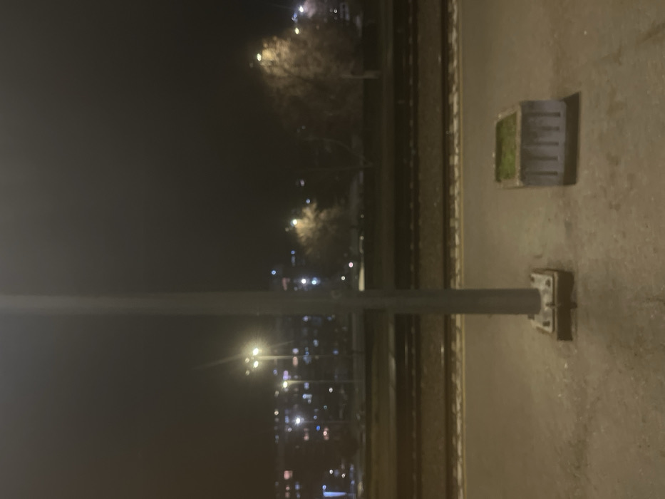 A nighttime urban scene is captured from a high vantage point, possibly a window. Streetlights and building lights illuminate the distant cityscape, which appears blurred. Closer to the viewer, a metal pole stands, affixed to the ground with bolts, with a planter box containing greenery on a concrete surface. A railing or divider is visible between the pole and the distant city lights. The scene is generally dark, with the artificial lights providing the primary source of illumination.