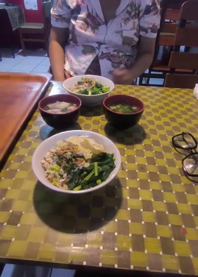 A person in a white floral shirt is sitting at a table with three bowls of food. The food appears to be a noodle dish with green vegetables and a light-colored broth. One bowl is being moved by a hand that is not the person's. There is a pair of glasses on the table, as well as a brown wooden tray. The table has a yellow and green checkered tablecloth. The background shows a restaurant setting with chairs and a sign.