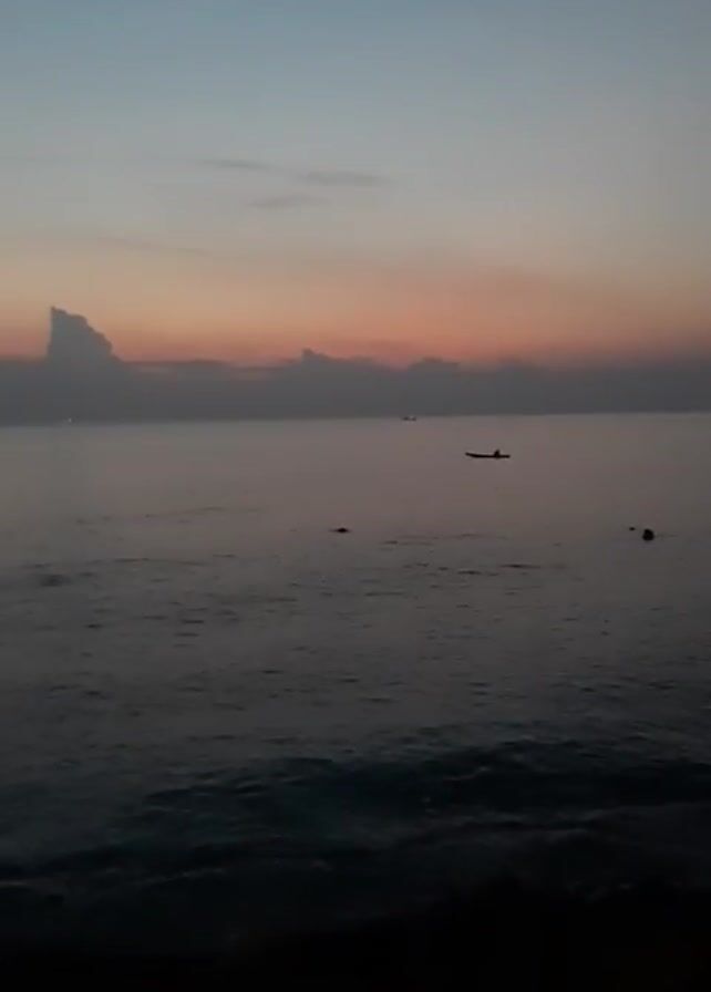 static shot of a calm sea at dusk or dawn. The sky transitions from a deep blue at the top to shades of orange and pink near the horizon, with a few clouds scattered across the skyline. Several small boats are visible on the water, including one with a discernible figure in it. The sea is dark and reflective, with gentle waves rippling across the surface. The foreground is a dark, indistinct area, likely the beach or shore.