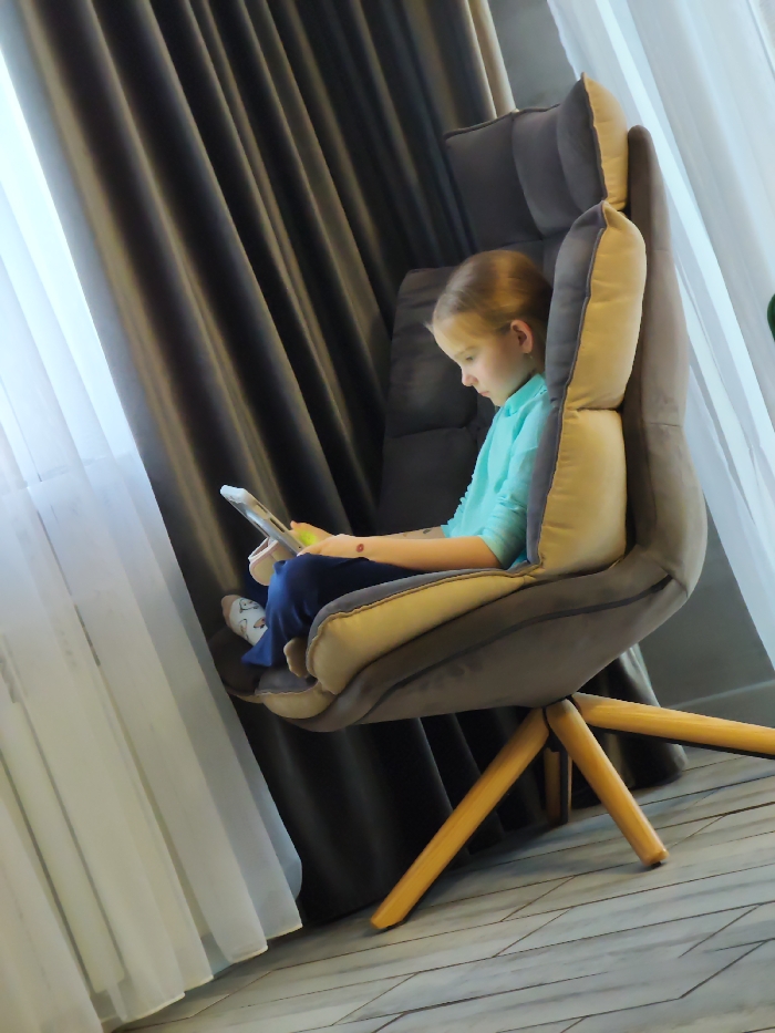 A young female child, estimated between 5-10 years old, with light-colored hair, is seated in a high-backed, two-toned grey and beige upholstered armchair with a four-legged wooden base. She wears a light blue long-sleeved shirt, dark blue trousers, and white socks with a subtle pattern. A small reddish mark is visible on her right forearm. The child holds a white tablet device horizontally, directing her gaze downwards at its illuminated screen. The setting is an indoor room, likely a private residence, in the city of Unknown, Unknown. A large window on the left is partially covered by sheer white and dark brown curtains. The floor is composed of light-colored, geometrically patterned tiles. Natural light from the window illuminates the scene.