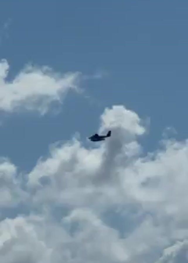 dark, single-engine aircraft flying in a blue sky with puffy white clouds. The video alternates between shots of the plane and shots of a choppy ocean under a cloudy sky. The audio includes dance music.