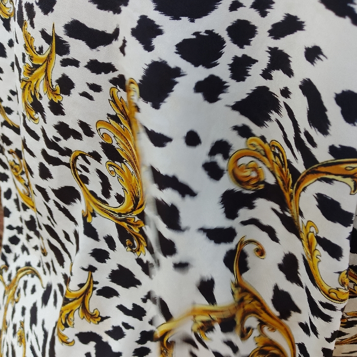 The image displays a close-up of a textile exhibiting a patterned design. The primary pattern consists of irregular black blotches on a white background, consistent with an animal print resembling cowhide or dalmatian spots. Interspersed throughout this black and white pattern are ornate, curvilinear golden-yellow motifs, indicative of baroque-style scrollwork or acanthus leaves. The fabric shows minor folds and creases, suggesting it is draped or loosely arranged. No individuals, other objects, or discernible environmental features are present within the frame. The content of the image itself does not provide any visual information to confirm a specific location within Estômbar e Parchal, Portugal.