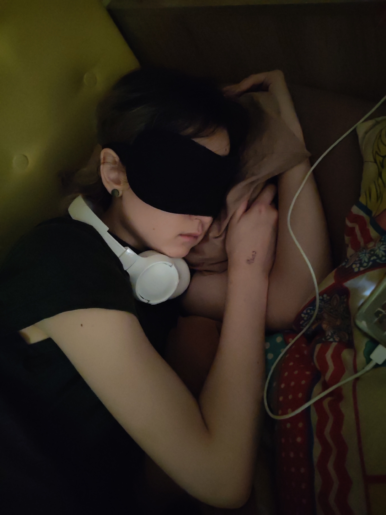 person sleeping on a couch. The person is wearing a black eye mask, a black t-shirt, and white headphones are around their neck. They are lying on a pillow and are covered with a patterned blanket. A phone with a charger plugged in is visible on the blanket. The location is likely indoors. There is no visual information provided within the image itself that would identify the location as the city of Chaikovsky, Russia.