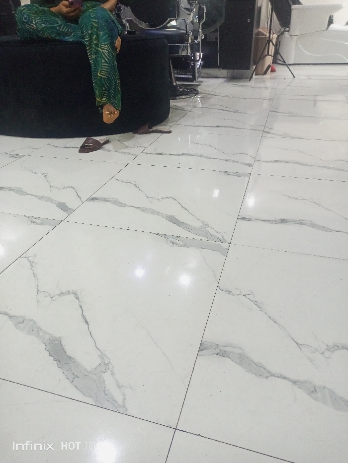 The scene depicts an interior view of a commercial establishment located in Abuja, Nigeria, likely a salon or spa. The floor is covered with large rectangular white tiles featuring prominent grey, marble-like veining and a reflective surface that shows distinct circular light reflections. In the upper left quadrant, a person is partially visible, seated on a dark, upholstered chair or bench. Their lower legs are clad in a patterned green and dark blue fabric garment. Their right foot is bare, with visible toenails, and is positioned above the tiled floor. Two dark brown open-toed slippers are on the floor near the person's feet: one to the left and slightly forward, the other further back and to the right. In the background, behind the seated person, a chrome-finished hydraulic salon chair with a black seat is visible. Further to the right, a white basin or sink unit, commonly found in salons, is present, with a black tripod stand nearby. The environment appears well-lit, primarily by artificial light. The text "Infinix HOT 10i" is visible in the bottom left corner of the image.